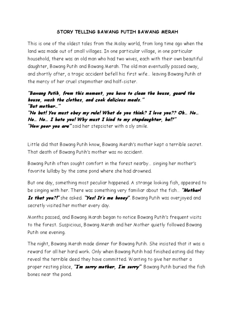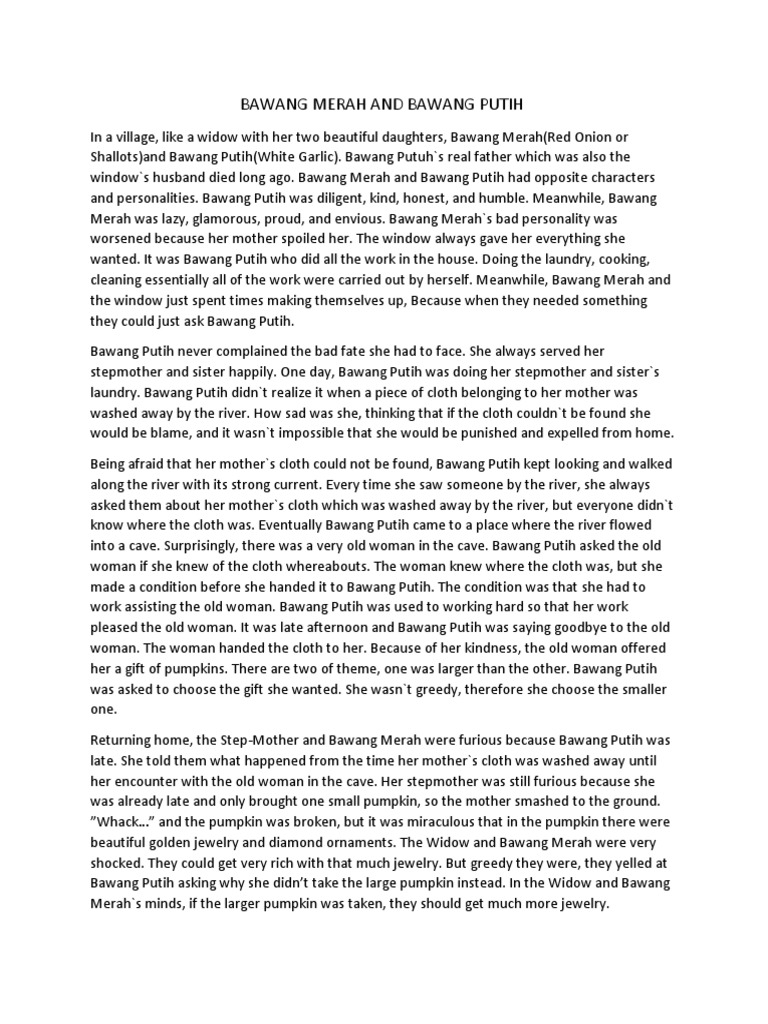 Shortly after that a tragic accident befell the first wife. View Story Telling Bawang Putih dan Bawang Merahdocx from A EN CREATIVE W at Trisakti School of Management. Kisah Bawang Merah Bawang Putih bercerita tentang kakak dan adik yang memiliki sifat dan perangai sangat berbeda serta mengenai ibu tiri yang tidak adil d.